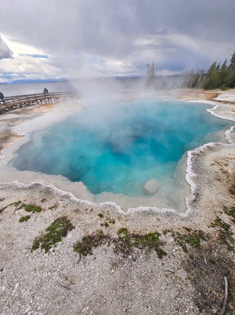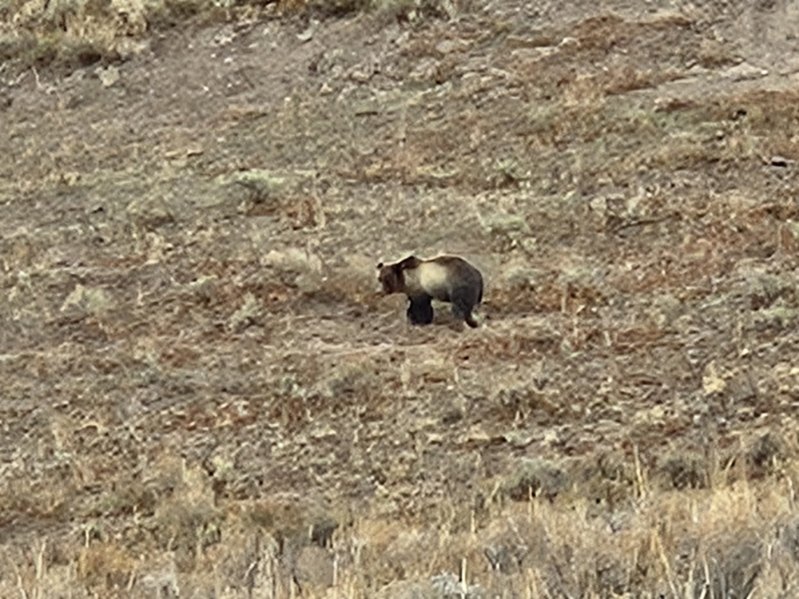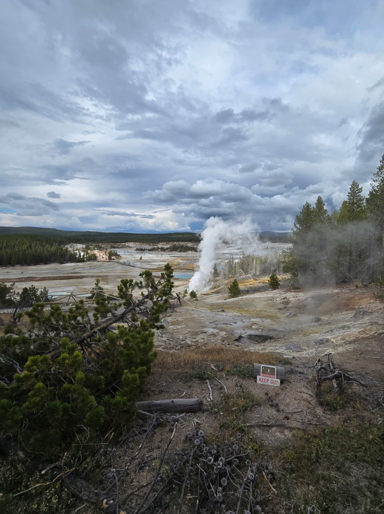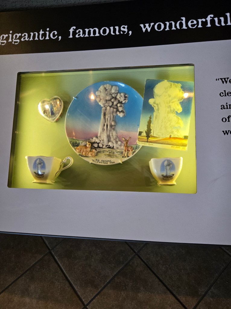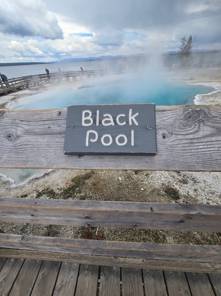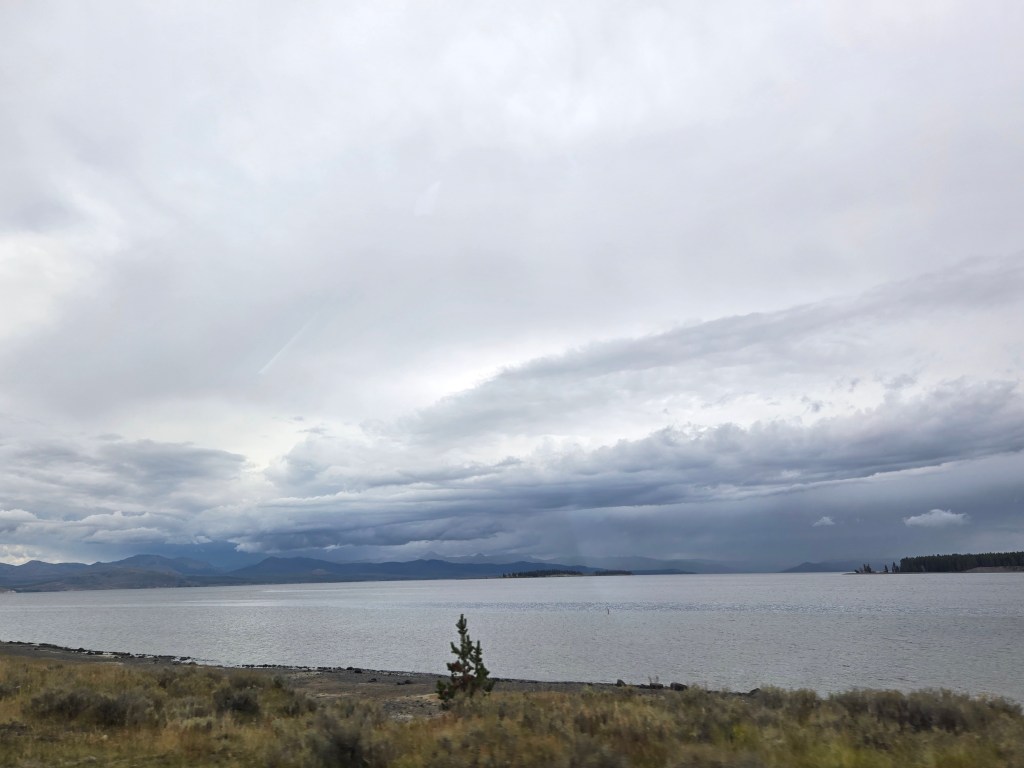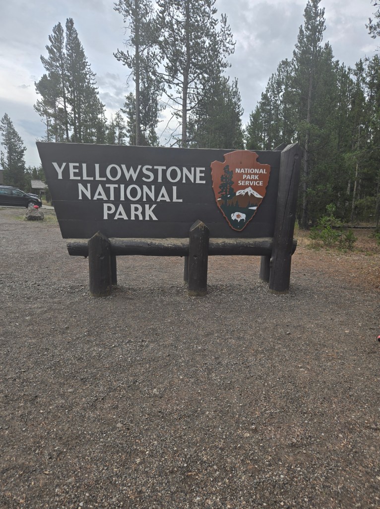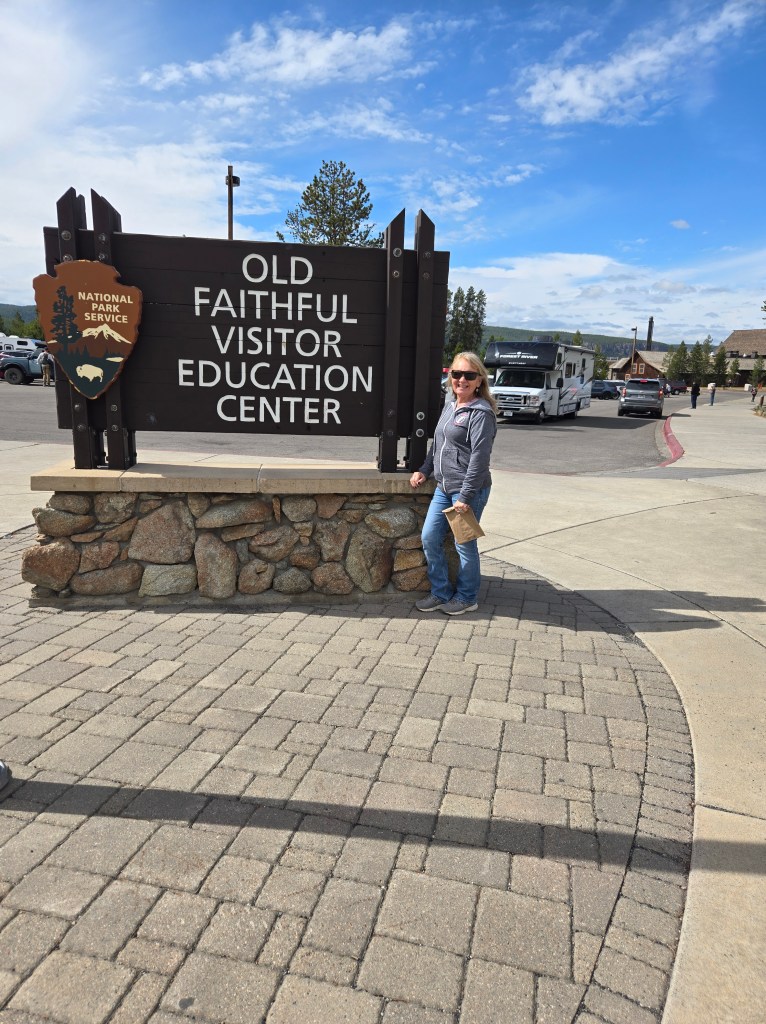 Cary, my mom and I headed out Sunday morning to spend the day in Yellowstone. We stopped at Grand Prismatic Springs and Old Faithful. We enjoyed lunch at the cafeteria at the old faithful inn. After the eruption, we went back and did some souvenier shopping. We made some more stops between rain showers and thunderstorms! We saw a bear, bison and elk!