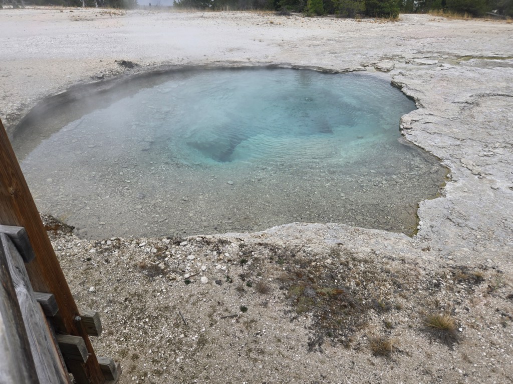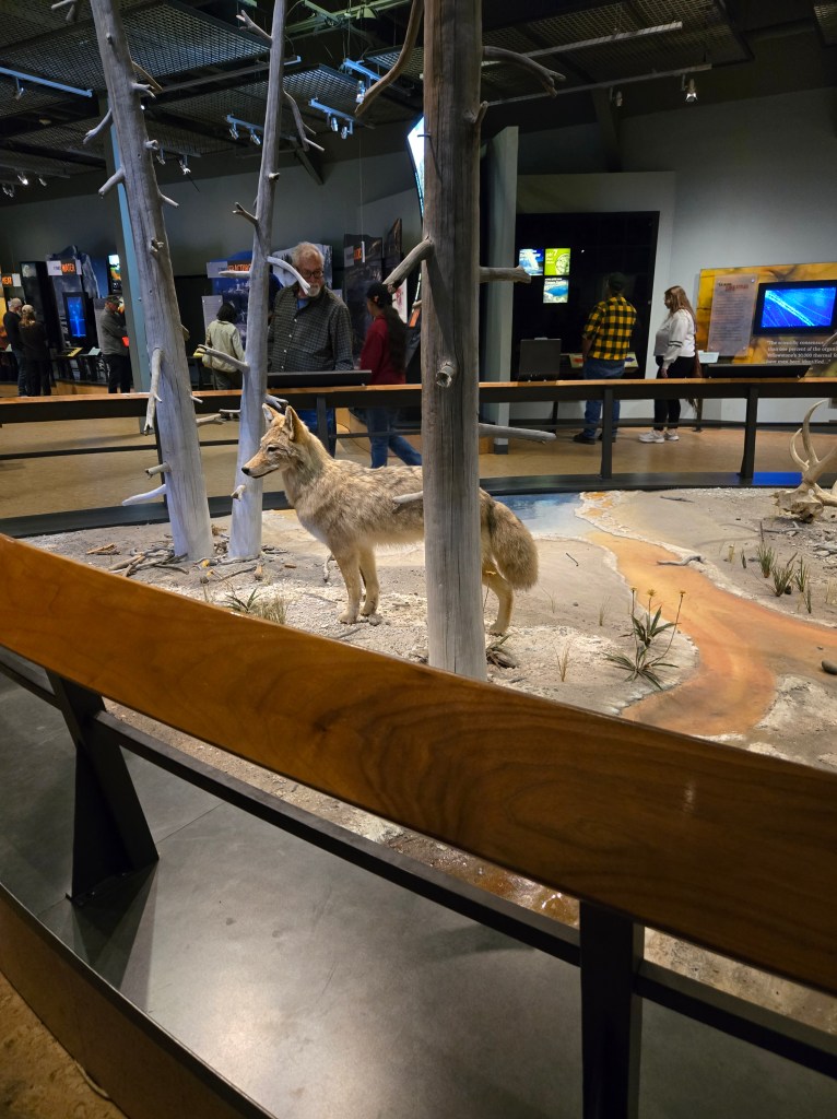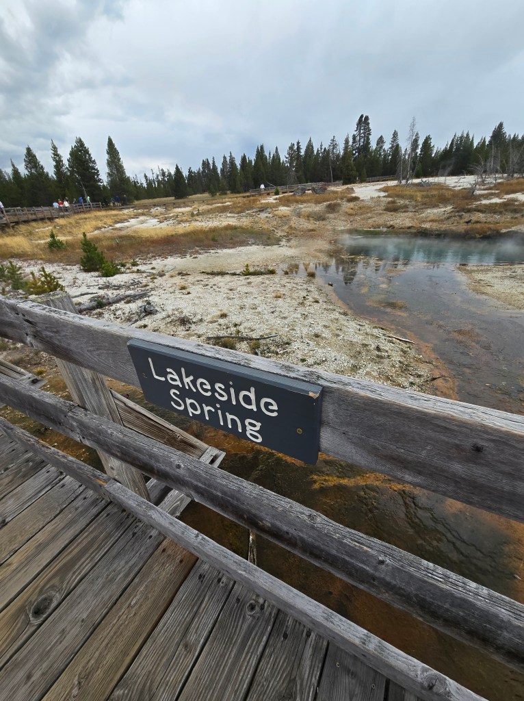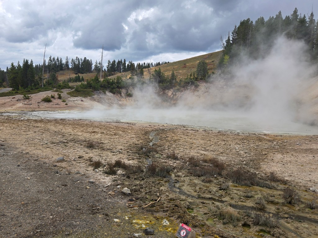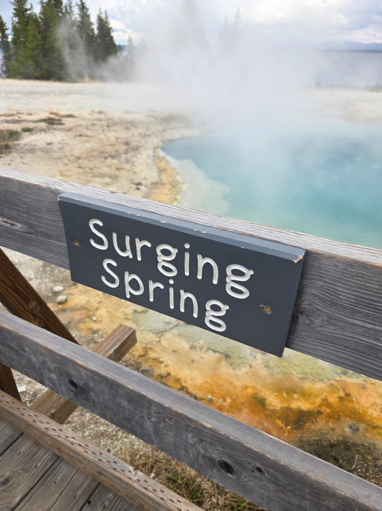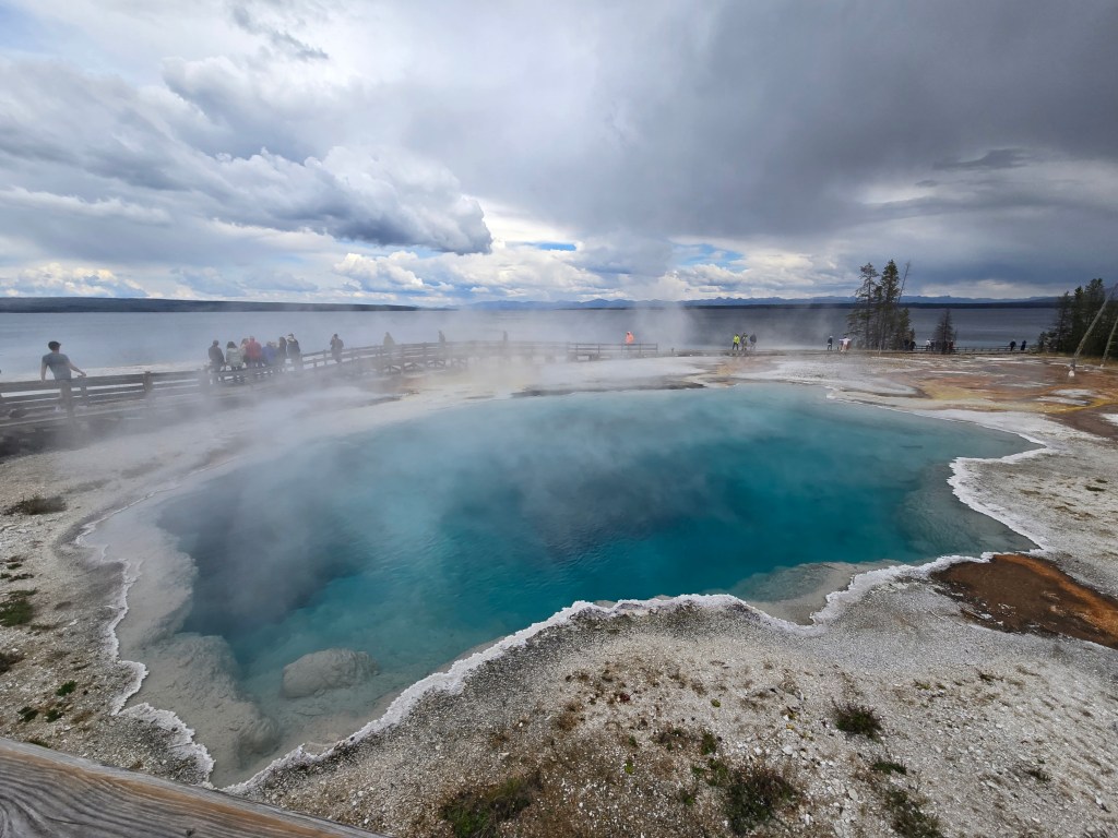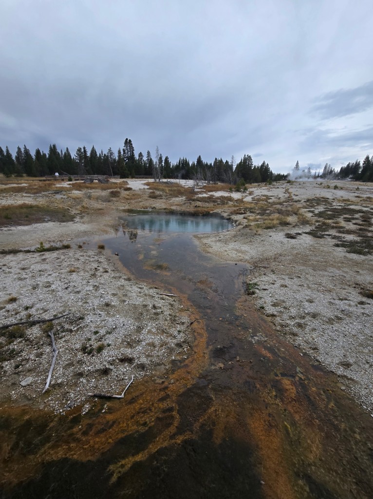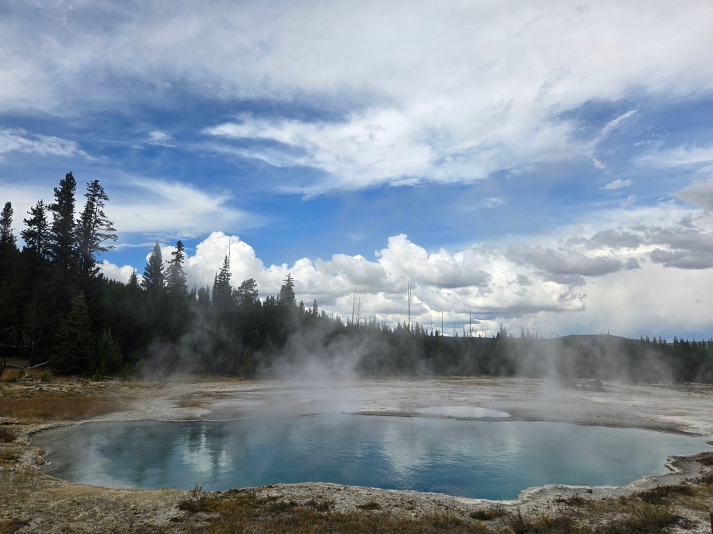 Cary, my mom and I headed out Sunday morning to spend the day in Yellowstone. We stopped at Grand Prismatic Springs and Old Faithful. We enjoyed lunch at the cafeteria at the old faithful inn. After the eruption, we went back and did some souvenier shopping. We made some more stops between rain showers and thunderstorms! We saw a bear, bison and elk!