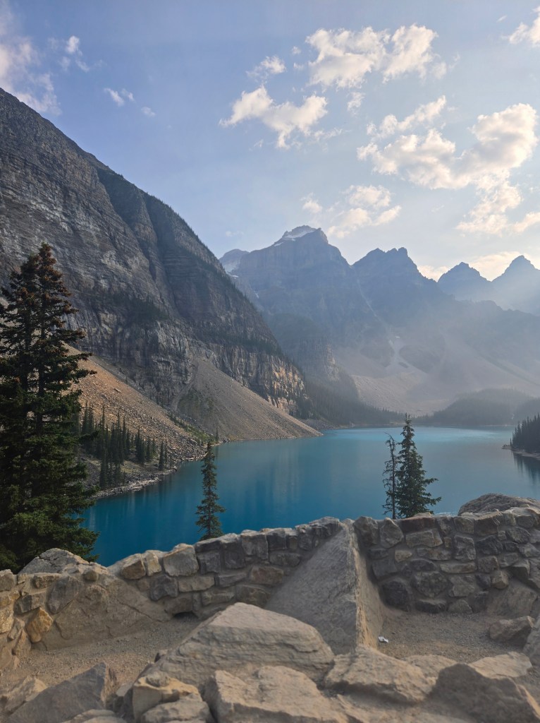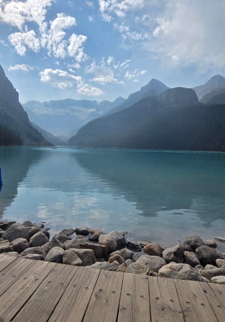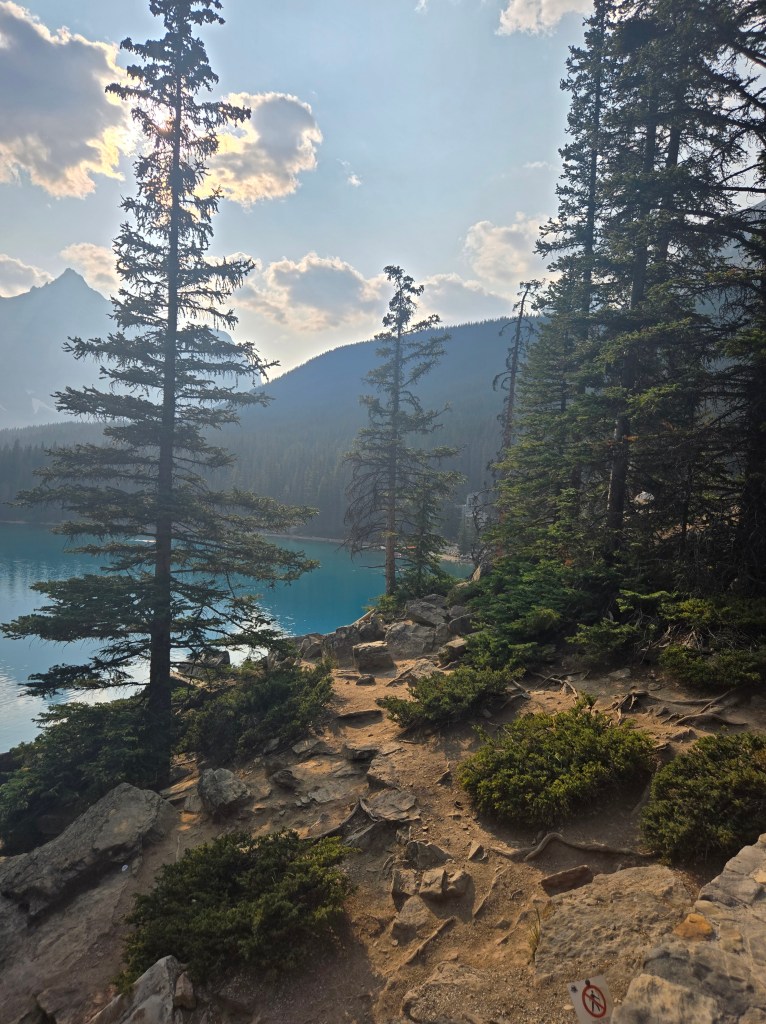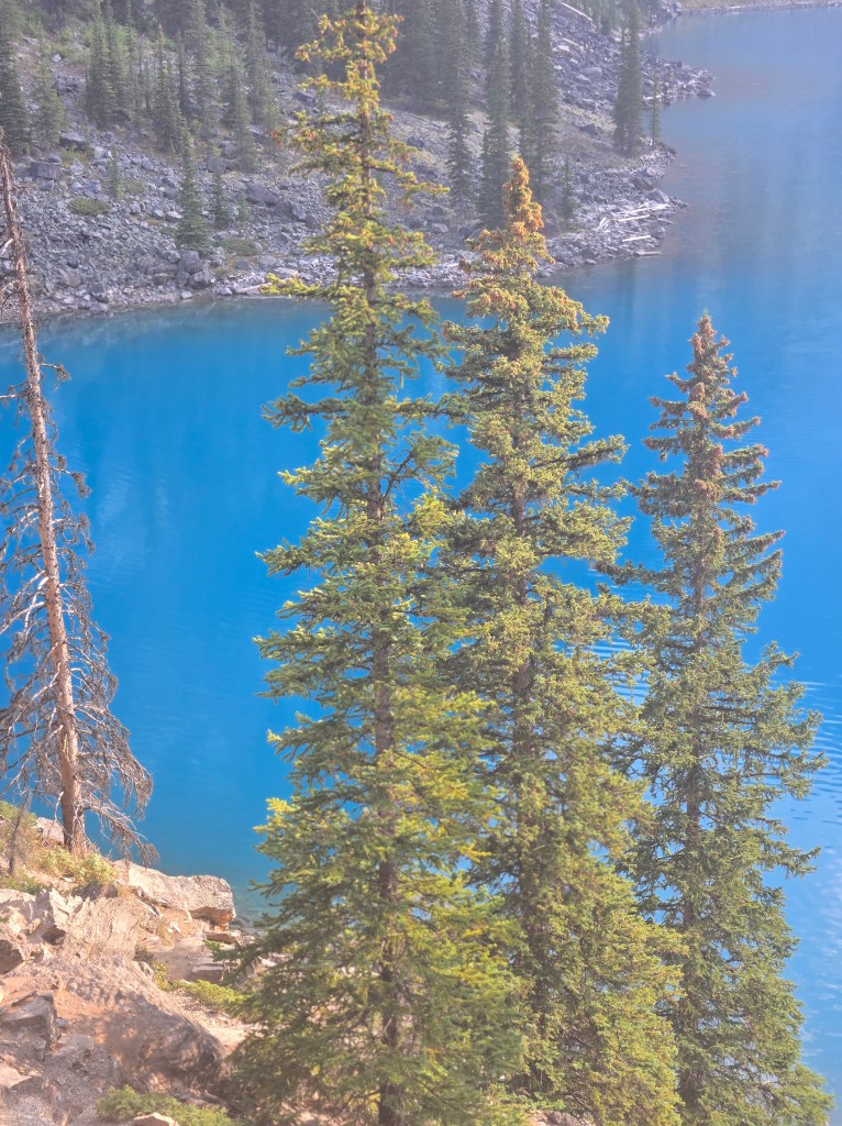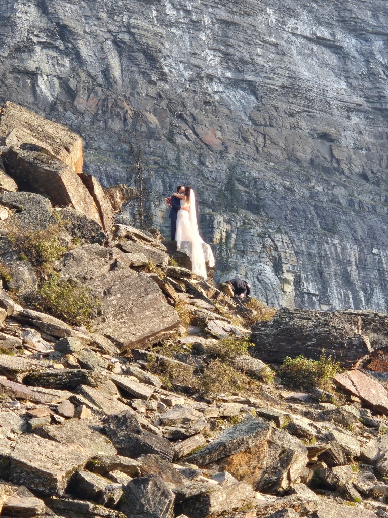 Lake Moraine was less crowded, thank goodness! We hiked to the top and the views are just amazing! There were different colors in the water, but the blue hue towards the one end was just stunning! We hit up the gift shop and got some snacks. As we walked around the edge of the lake, we saw a bride having photos taken up on the viewpoint. It was cool to watch, those two will have some epic wedding photos!