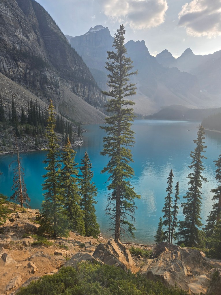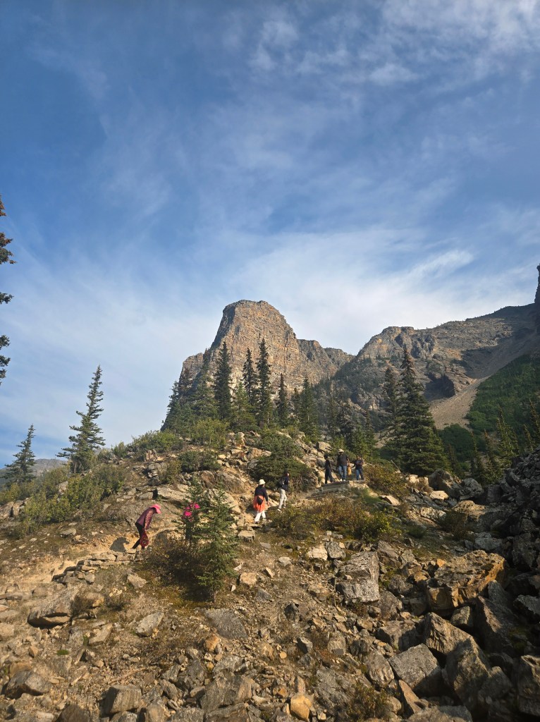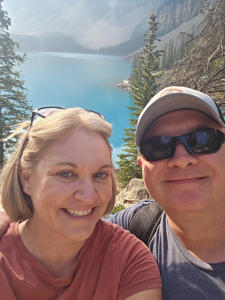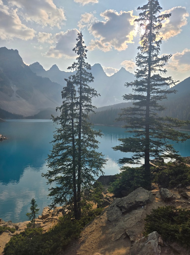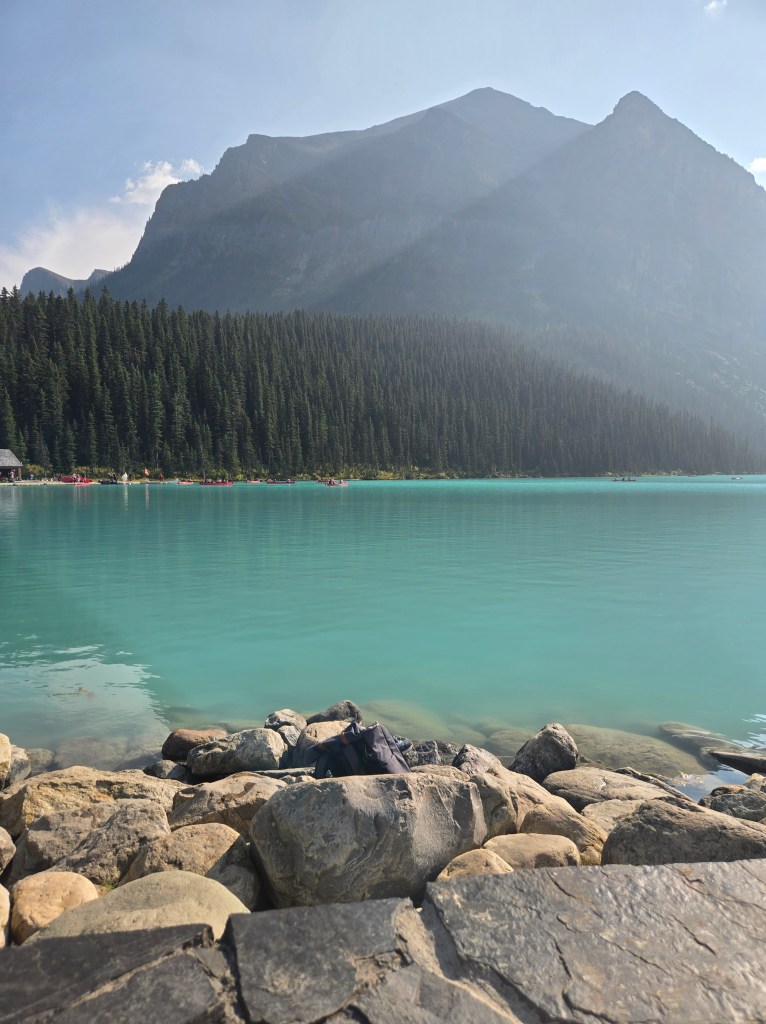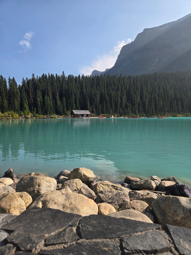 Lake Moraine was less crowded, thank goodness! We hiked to the top and the views are just amazing! There were different colors in the water, but the blue hue towards the one end was just stunning! We hit up the gift shop and got some snacks. As we walked around the edge of the lake, we saw a bride having photos taken up on the viewpoint. It was cool to watch, those two will have some epic wedding photos!